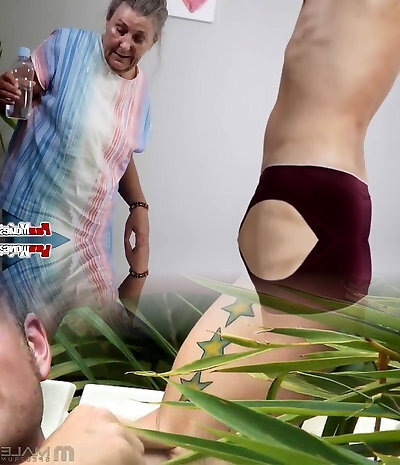 Lewd busty old whore gives massagist a blowjob before rear end fuck