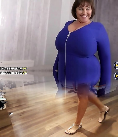 Plumper MILF in blue dress show her huge boobies and masturbating