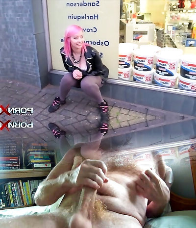 Horny pink haired emo girlie in tight yoga pants pisses outdoors for dude